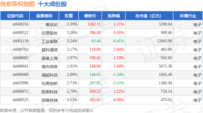 证券之星消息,10月13日,信息等权(000077)指数报收于6350.87点,涨1.39%,成交1618.86亿元,换手率2.83%。当日该指数成份股中,上涨的有30家,沪硅产业以10.83%的涨幅领涨,下跌的有20家,闻泰科技以10.0%的跌幅领跌。