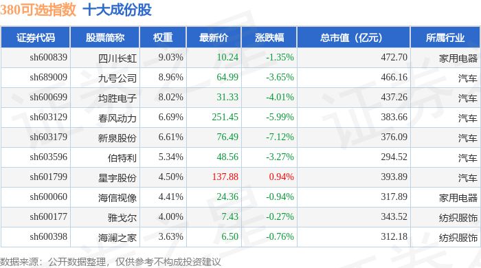 证券之星消息,10月13日,380可选(000107)指数报收于5850.18点,跌2.58%,成交155.42亿元,换手率1.78%。当日该指数成份股中,上涨的有6家,岱美股份以2.86%的涨幅领涨,下跌的有28家,新泉股份以7.12%的跌幅领跌。