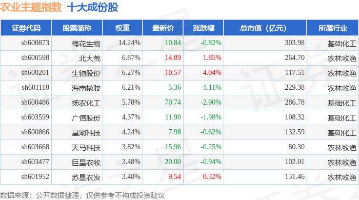 证券之星消息,10月13日,农业主题(000122)指数报收于1613.6点,跌0.06%,成交68.66亿元,换手率2.44%。当日该指数成份股中,上涨的有12家,生物股份以4.04%的涨幅领涨,下跌的有17家,扬农化工以2.9%的跌幅领跌。