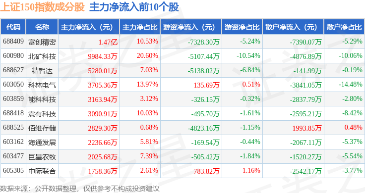 资金流向方面,上证150(000133)指数成份股当日主力资金净流出合计12.98亿元,游资资金净流出合计1.83亿元,散户资金净流入合计14.81亿元。成份股资金流向详情见下表: