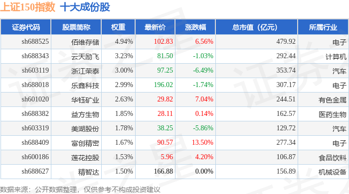 证券之星消息,10月13日,上证150(000133)指数报收于6599.52点,涨0.24%,成交491.16亿元,换手率4.08%。当日该指数成份股中,上涨的有48家,爱科赛博以13.73%的涨幅领涨,下跌的有100家,日盈电子以8.58%的跌幅领跌。