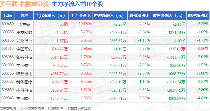 资金流向方面,沪互联+(000162)指数成份股当日主力资金净流出合计16.2亿元,游资资金净流入合计3.02亿元,散户资金净流入合计13.18亿元。成份股资金流向详情见下表: