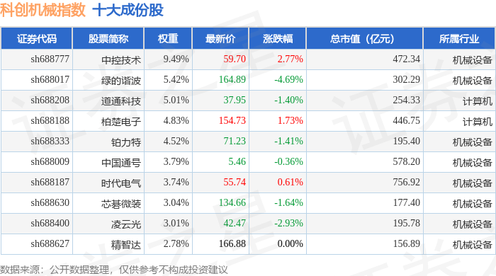证券之星消息,10月13日,科创机械(000693)指数报收于1426.14点,涨0.09%,成交202.06亿元,换手率1.8%。当日该指数成份股中,上涨的有19家,骄成超声以11.97%的涨幅领涨,下跌的有30家,伟创电气以7.15%的跌幅领跌。