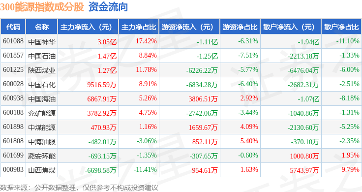 资金流向方面,300能源(000908)指数成份股当日主力资金净流入合计7.06亿元,游资资金净流出合计3.23亿元,散户资金净流出合计3.83亿元。成份股资金流向详情见下表: