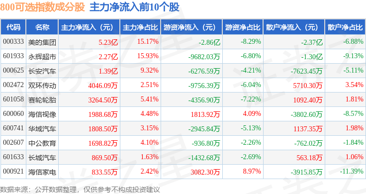 资金流向方面,800可选(000931)指数成份股当日主力资金净流出合计41.91亿元,游资资金净流入合计6.31亿元,散户资金净流入合计35.6亿元。成份股资金流向详情见下表: