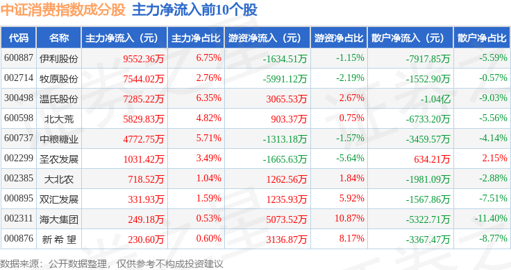 资金流向方面,中证消费(000932)指数成份股当日主力资金净流出合计8.61亿元,游资资金净流入合计8.89亿元,散户资金净流出合计2731.02万元。成份股资金流向详情见下表: