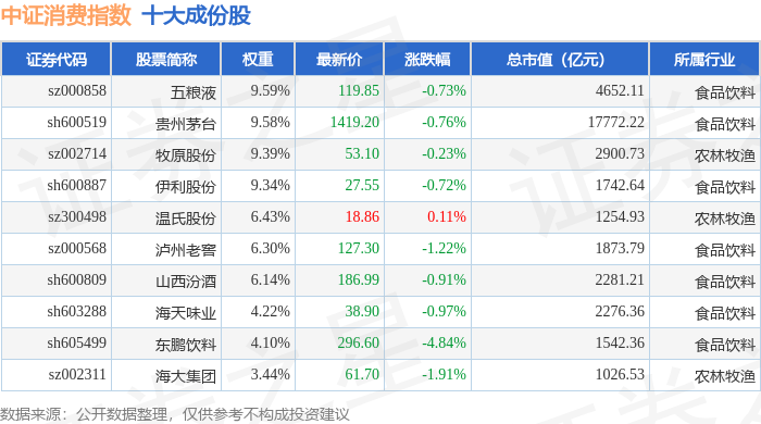中证消费(000932)指数十大成份股详情如下: