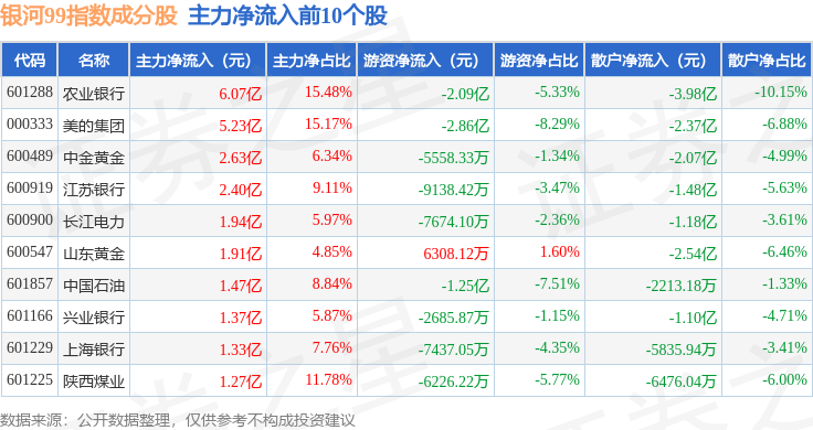 资金流向方面,银河99(000959)指数成份股当日主力资金净流出合计105.79亿元,游资资金净流入合计35.46亿元,散户资金净流入合计70.33亿元。成份股资金流向详情见下表: