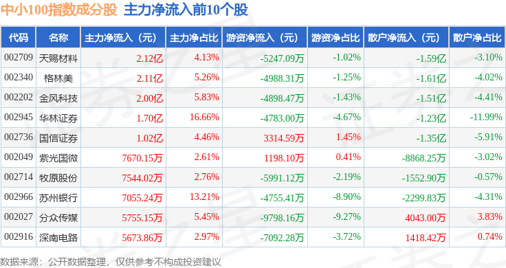 资金流向方面,中小100(399005)指数成份股当日主力资金净流出合计68.32亿元,游资资金净流入合计17.91亿元,散户资金净流入合计50.42亿元。成份股资金流向详情见下表: