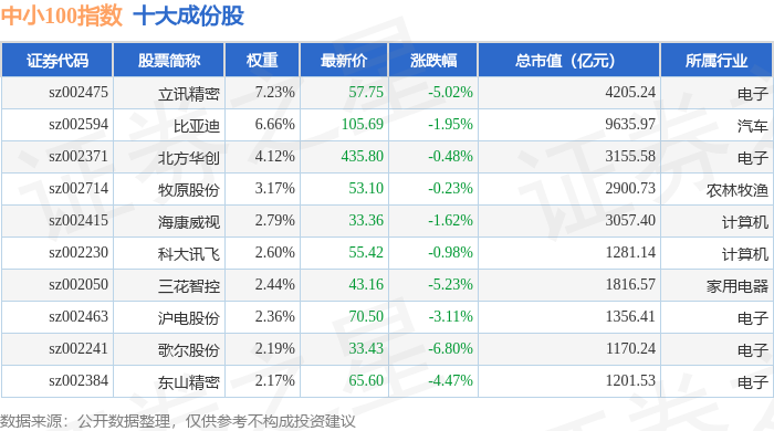 中小100(399005)指数十大成份股详情如下:
