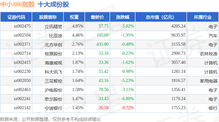 资金流向方面,中小300(399008)指数成份股当日主力资金净流出合计95.83亿元,游资资金净流入合计13.62亿元,散户资金净流入合计82.21亿元。成份股资金流向详情见下表: