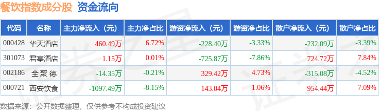 资金流向方面,餐饮指数(399238)成份股当日主力资金净流出合计650.19万元,游资资金净流出合计481.8万元,散户资金净流入合计1131.99万元。成份股资金流向详情见下表: