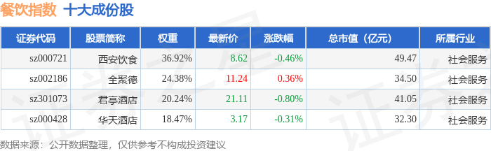 证券之星消息,10月13日,餐饮指数(399238)报收于1287.67点,跌0.3%,成交3.65亿元,换手率2.4%。当日该指数成份股中,上涨的有1家,全聚德以0.36%的涨幅领涨,下跌的有3家,君亭酒店以0.8%的跌幅领跌。