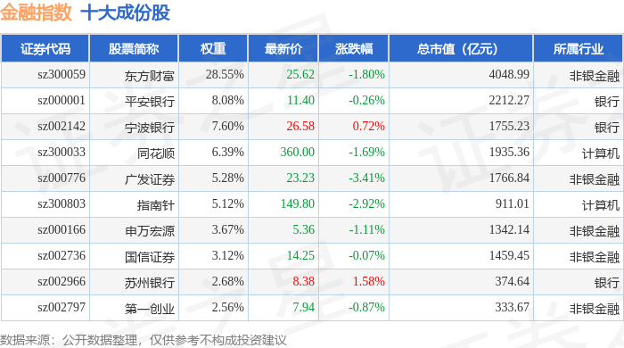 证券之星消息,10月13日,金融指数(399240)报收于1686.41点,跌1.1%,成交425.56亿元,换手率1.54%。当日该指数成份股中,上涨的有8家,华林证券以4.69%的涨幅领涨,下跌的有26家,广发证券以3.41%的跌幅领跌。