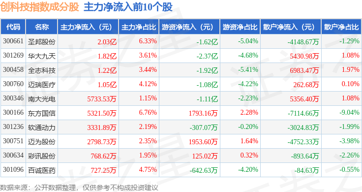 资金流向方面,创科技(399276)指数成份股当日主力资金净流出合计33.83亿元,游资资金净流出合计3.28亿元,散户资金净流入合计37.11亿元。成份股资金流向详情见下表: