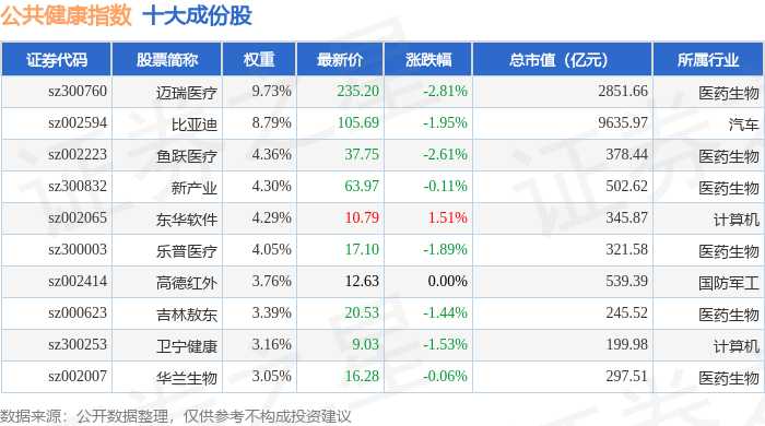 公共健康(399277)指数十大成份股详情如下: