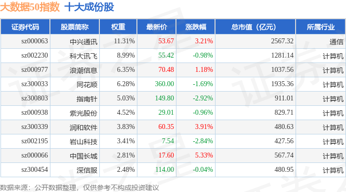 大数据50(399282)指数十大成份股详情如下: