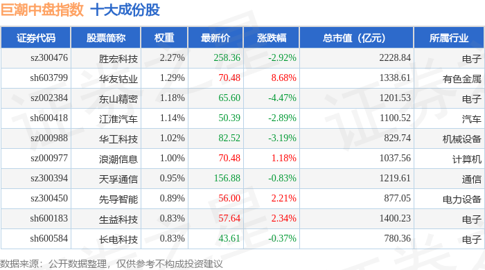 证券之星消息,10月13日,巨潮中盘(399315)指数报收于4718.74点,跌0.18%,成交3659.66亿元,换手率2.06%。当日该指数成份股中,上涨的有97家,华大九天以11.78%的涨幅领涨,下跌的有199家,闻泰科技以10.0%的跌幅领跌。