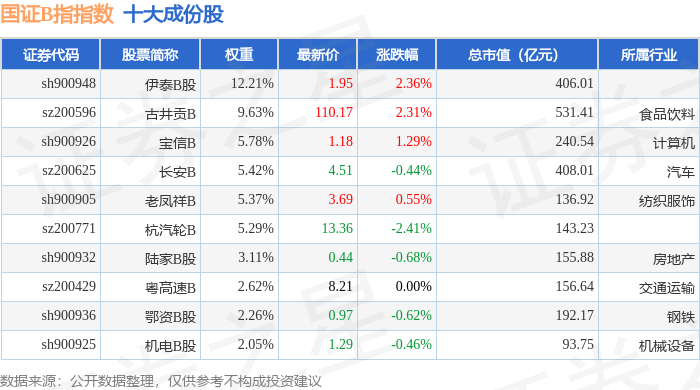 证券之星消息,10月13日,国证B指(399318)指数报收于5387.75点,涨0.24%,成交3.22亿元,换手率0.27%。当日该指数成份股中,上涨的有18家,深纺织B以8.57%的涨幅领涨,下跌的有54家,三毛B股以3.14%的跌幅领跌。