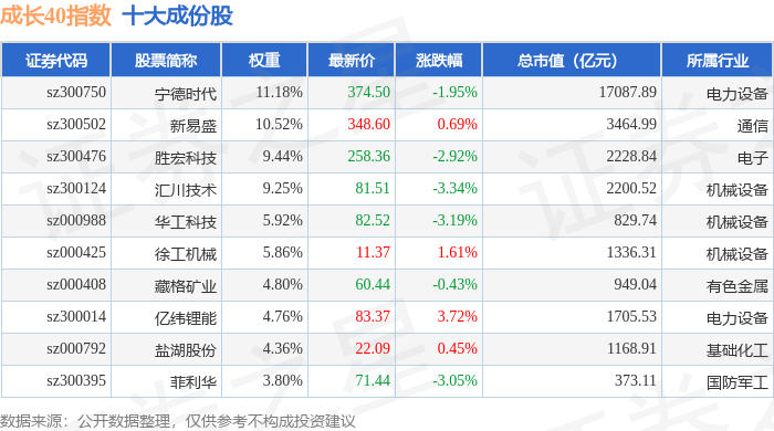 成长40(399326)指数十大成份股详情如下: