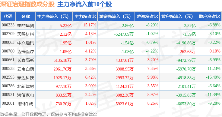 资金流向方面,深证治理(399328)指数成份股当日主力资金净流出合计30.58亿元,游资资金净流入合计6.89亿元,散户资金净流入合计23.69亿元。成份股资金流向详情见下表: