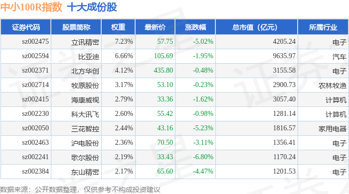 证券之星消息,10月13日,中小100R(399333)指数报收于9970.53点,跌1.25%,成交1783.02亿元,换手率2.16%。当日该指数成份股中,上涨的有24家,赣锋锂业以9.1%的涨幅领涨,下跌的有73家,歌尔股份以6.8%的跌幅领跌。
