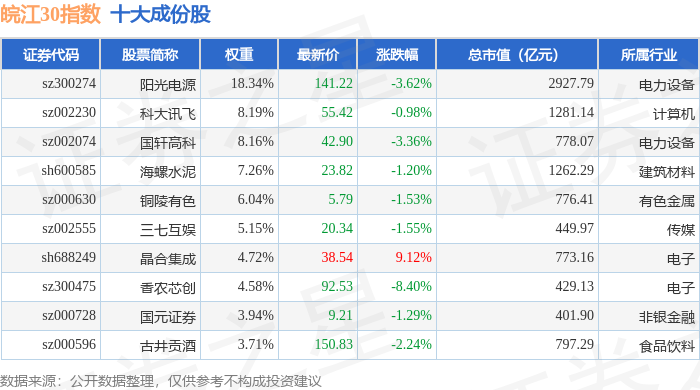 证券之星消息,10月13日,皖江30(399350)指数报收于2858.38点,跌1.76%,成交462.91亿元,换手率3.38%。当日该指数成份股中,上涨的有5家,合肥城建以9.99%的涨幅领涨,下跌的有25家,香农芯创以8.4%的跌幅领跌。
