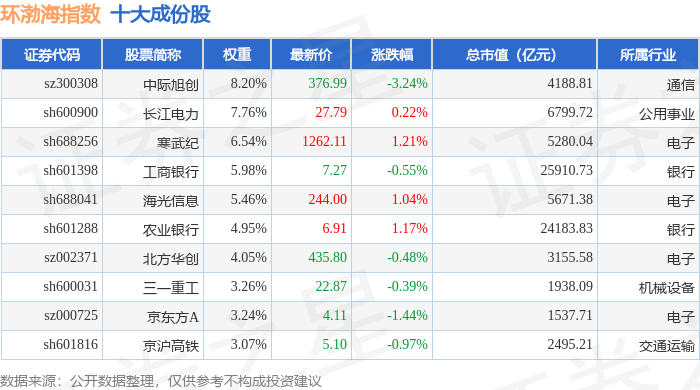 证券之星消息,10月13日,环渤海(399357)指数报收于3373.62点,跌0.3%,成交1029.64亿元,换手率0.41%。当日该指数成份股中,上涨的有13家,金山办公以8.32%的涨幅领涨,下跌的有25家,中际旭创以3.24%的跌幅领跌。
