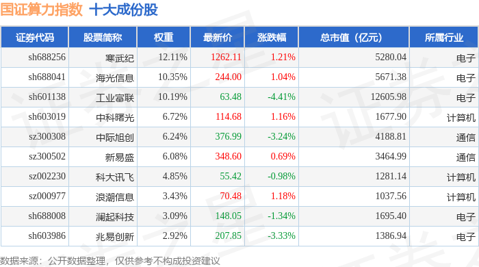 证券之星消息,10月13日,国证算力(399363)指数报收于9041.89点,跌0.37%,成交1882.72亿元,换手率3.45%。当日该指数成份股中,上涨的有22家,全志科技以7.45%的涨幅领涨,下跌的有28家,神州数码以7.32%的跌幅领跌。
