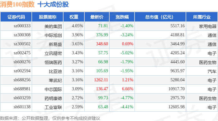证券之星消息,10月13日,消费100(399364)指数报收于10920.56点,跌1.25%,成交3481.32亿元,换手率2.17%。当日该指数成份股中,上涨的有26家,沪硅产业以10.83%的涨幅领涨,下跌的有73家,闻泰科技以10.0%的跌幅领跌。