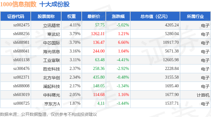 证券之星消息,10月13日,1000信息(399388)指数报收于6675.05点,跌0.06%,成交4335.37亿元,换手率3.55%。当日该指数成份股中,上涨的有81家,华虹公司以20.0%的涨幅领涨,下跌的有97家,神州数码以7.32%的跌幅领跌。