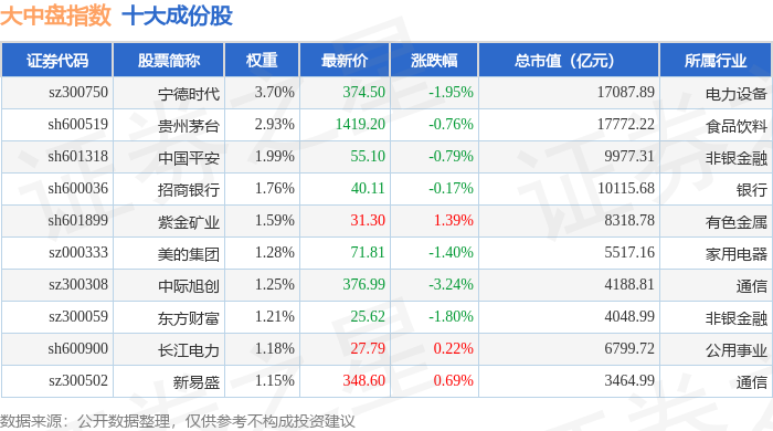 证券之星消息,10月13日,大中盘(399400)指数报收于4158.25点,跌0.44%,成交9513.62亿元,换手率1.14%。当日该指数成份股中,上涨的有163家,华大九天以11.78%的涨幅领涨,下跌的有328家,闻泰科技以10.0%的跌幅领跌。