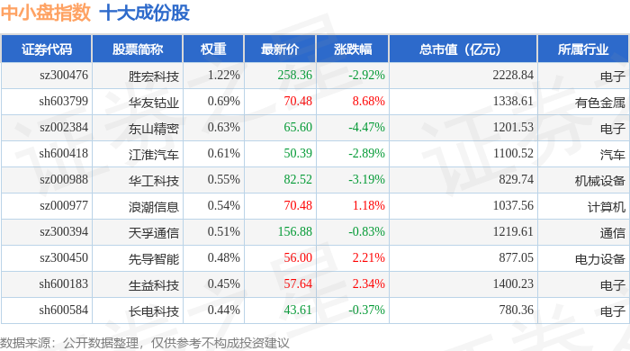 证券之星消息,10月13日,中小盘(399401)指数报收于4767.62点,跌0.2%,成交7403.07亿元,换手率2.25%。当日该指数成份股中,上涨的有245家,华虹公司以20.0%的涨幅领涨,下跌的有543家,闻泰科技以10.0%的跌幅领跌。