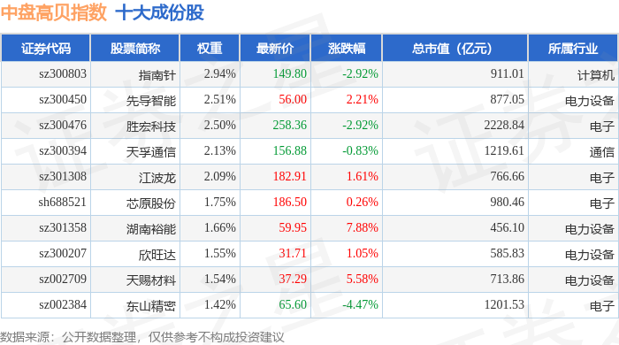 证券之星消息,10月13日,中盘高贝(399407)指数报收于3163.69点,涨0.06%,成交2009.3亿元,换手率3.23%。当日该指数成份股中,上涨的有39家,华大九天以11.78%的涨幅领涨,下跌的有60家,闻泰科技以10.0%的跌幅领跌。