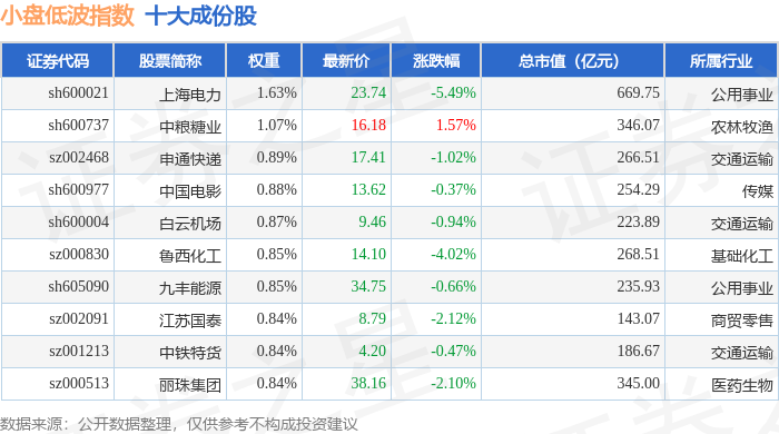 证券之星消息,10月13日,小盘低波(399408)指数报收于15224.08点,跌0.67%,成交560.07亿元,换手率1.77%。当日该指数成份股中,上涨的有32家,白银有色以10.04%的涨幅领涨,下跌的有114家,上海电力以5.49%的跌幅领跌。