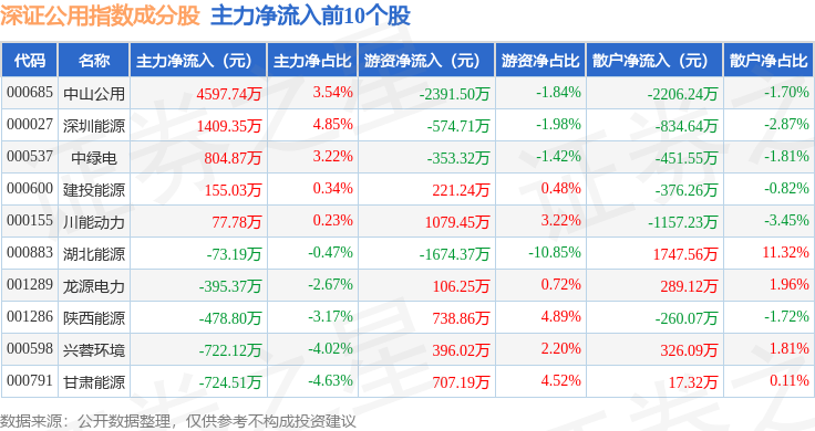 资金流向方面,深证公用(399622)指数成份股当日主力资金净流出合计2.28亿元,游资资金净流入合计5022.28万元,散户资金净流入合计1.78亿元。成份股资金流向详情见下表: