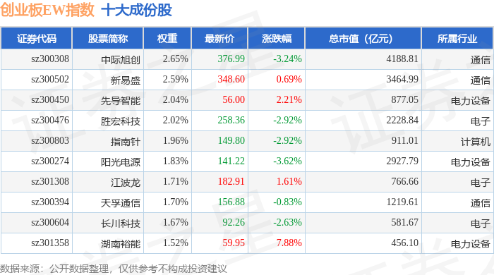 创业板EW(399635)指数十大成份股详情如下:
