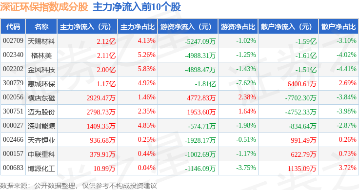 资金流向方面,深证环保(399638)指数成份股当日主力资金净流出合计42.93亿元,游资资金净流入合计8.53亿元,散户资金净流入合计34.4亿元。成份股资金流向详情见下表: