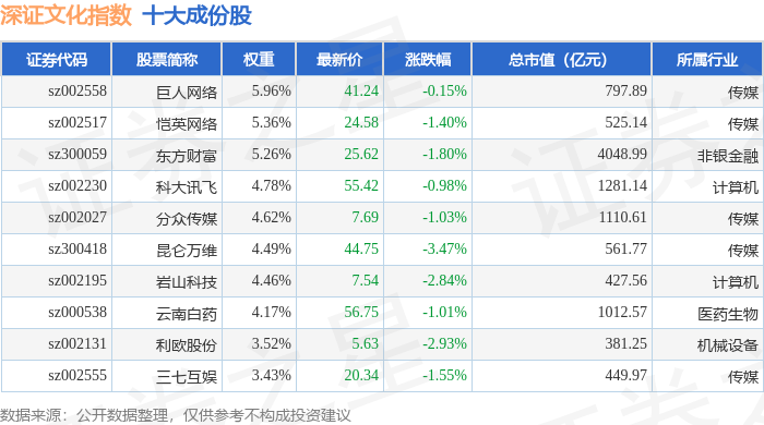 资金流向方面,深证文化(399654)指数成份股当日主力资金净流出合计19.44亿元,游资资金净流入合计1.9亿元,散户资金净流入合计17.53亿元。成份股资金流向详情见下表: