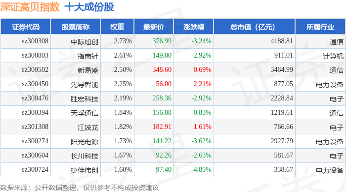 证券之星消息,10月13日,深证高贝(399662)指数报收于2373.51点,跌0.28%,成交3026.93亿元,换手率4.03%。当日该指数成份股中,上涨的有33家,金力永磁以17.6%的涨幅领涨,下跌的有66家,神州数码以7.32%的跌幅领跌。