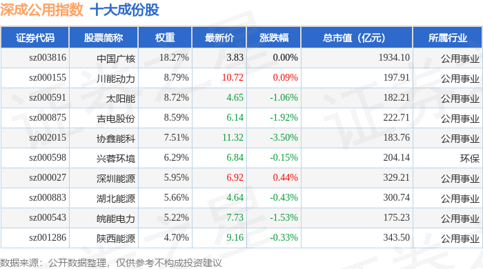 证券之星消息,10月13日,深成公用(399689)指数报收于859.75点,跌0.76%,成交49.99亿元,换手率0.96%。当日该指数成份股中,上涨的有3家,龙源电力以0.44%的涨幅领涨,下跌的有12家,协鑫能科以3.5%的跌幅领跌。