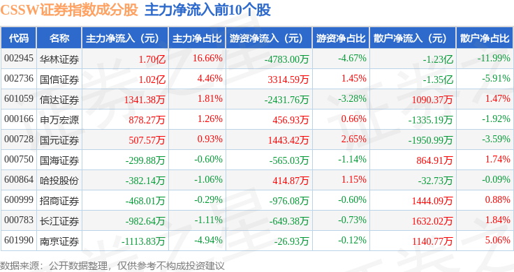 资金流向方面,CSSW证券(399707)指数成份股当日主力资金净流出合计34.99亿元,游资资金净流入合计13.94亿元,散户资金净流入合计21.05亿元。成份股资金流向详情见下表: