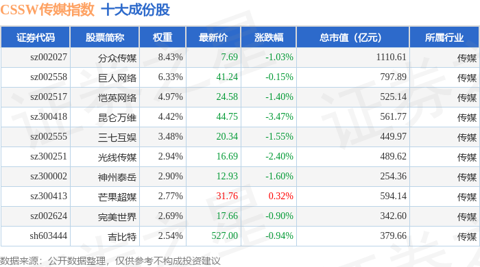 证券之星消息,10月13日,CSSW传媒(399810)指数报收于3081.47点,跌1.65%,成交385.16亿元,换手率2.69%。当日该指数成份股中,上涨的有5家,视觉中国以7.41%的涨幅领涨,下跌的有92家,易点天下以6.14%的跌幅领跌。