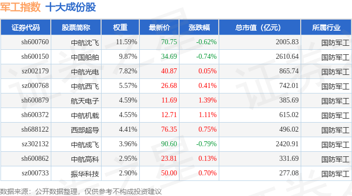 证券之星消息,10月13日,军工指数(399959)报收于1686.6点,涨0.43%,成交245.71亿元,换手率1.71%。当日该指数成份股中,上涨的有30家,晶品特装以6.66%的涨幅领涨,下跌的有10家,新雷能以1.79%的跌幅领跌。