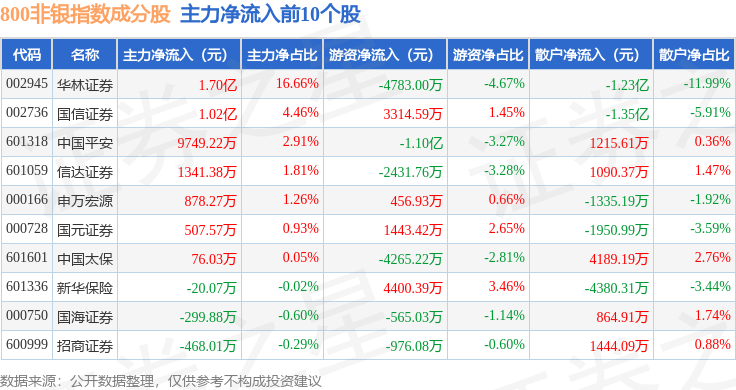 资金流向方面,800非银(399966)指数成份股当日主力资金净流出合计34.0亿元,游资资金净流入合计13.29亿元,散户资金净流入合计20.71亿元。成份股资金流向详情见下表:
