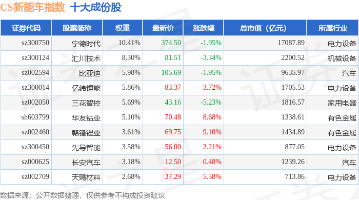证券之星消息,10月13日,CS新能车(399976)指数报收于4398.67点,涨0.53%,成交1326.77亿元,换手率4.62%。当日该指数成份股中,上涨的有28家,多氟多以9.98%的涨幅领涨,下跌的有22家,三花智控以5.23%的跌幅领跌。