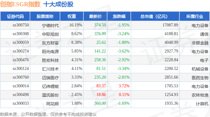 资金流向方面,创指ESGR(470028)指数成份股当日主力资金净流出合计57.43亿元,游资资金净流入合计1.89亿元,散户资金净流入合计55.55亿元。成份股资金流向详情见下表: