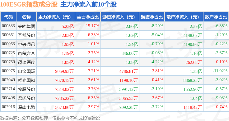 资金流向方面,100ESGR(470027)指数成份股当日主力资金净流出合计86.72亿元,游资资金净流入合计16.97亿元,散户资金净流入合计69.75亿元。成份股资金流向详情见下表: