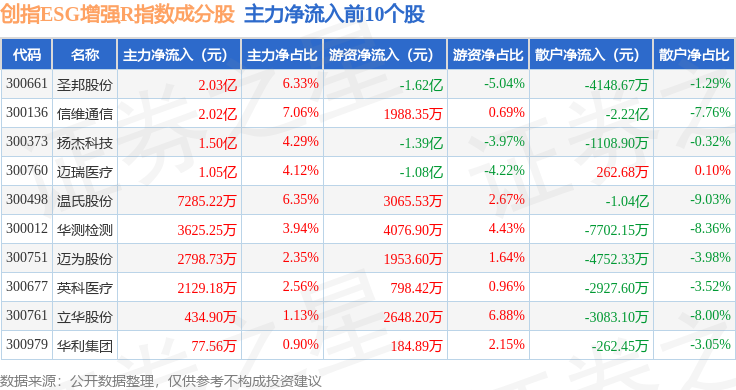 资金流向方面,创指ESG增强R(470034)指数成份股当日主力资金净流出合计50.4亿元,游资资金净流入合计7.72亿元,散户资金净流入合计42.68亿元。成份股资金流向详情见下表: