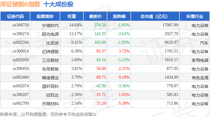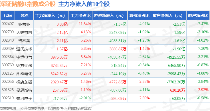 资金流向方面,深证储能R(470036)指数成份股当日主力资金净流出合计53.3亿元,游资资金净流入合计8.62亿元,散户资金净流入合计44.68亿元。成份股资金流向详情见下表: